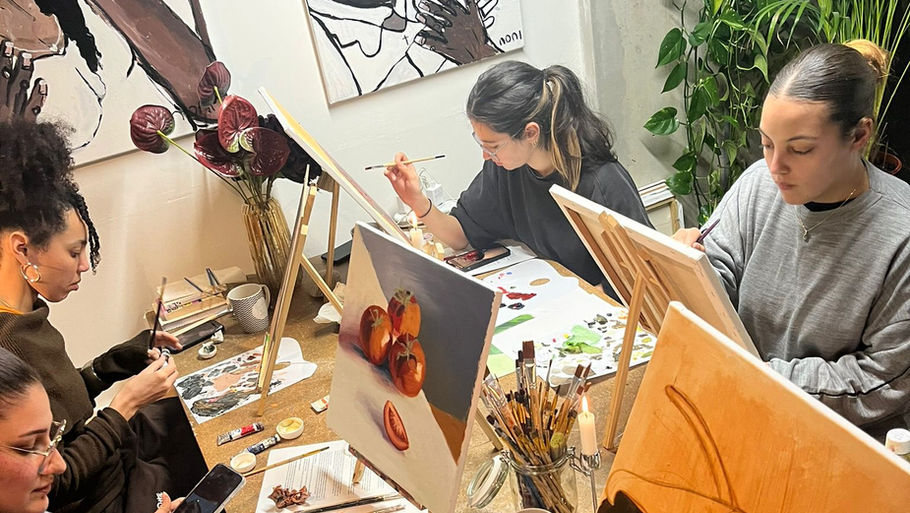 Workshops cover the fundamentals of oil painting: working with mediums, building layered compositions, colour theory, and translating an idea onto canvas. All materials are provided.
